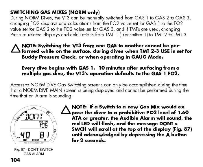 During NORM Dives, the VT3 can be manually switched from GAS 1 to GAS 2 to GAS 3,