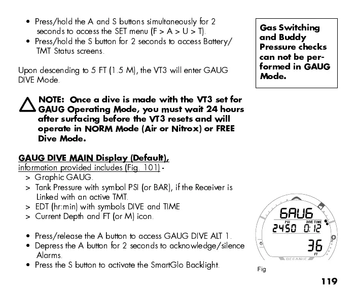 Press/release the A button to access GAUG DIVE ALT 1.