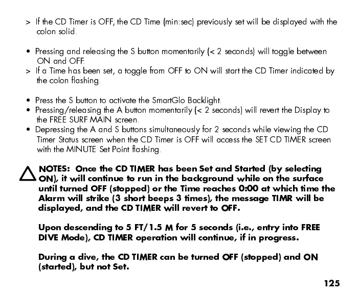 During a dive, the CD TIMER can be turned OFF (stopped) and ON