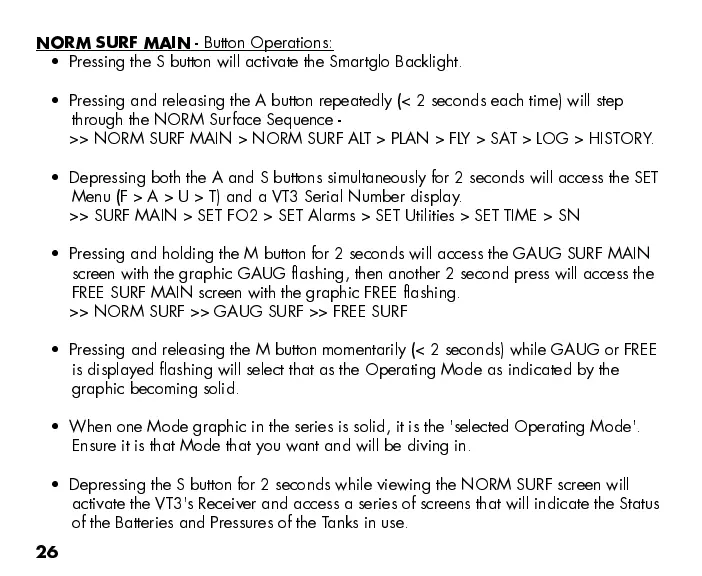 Depressing the S button for 2 seconds while viewing the NORM SURF screen will