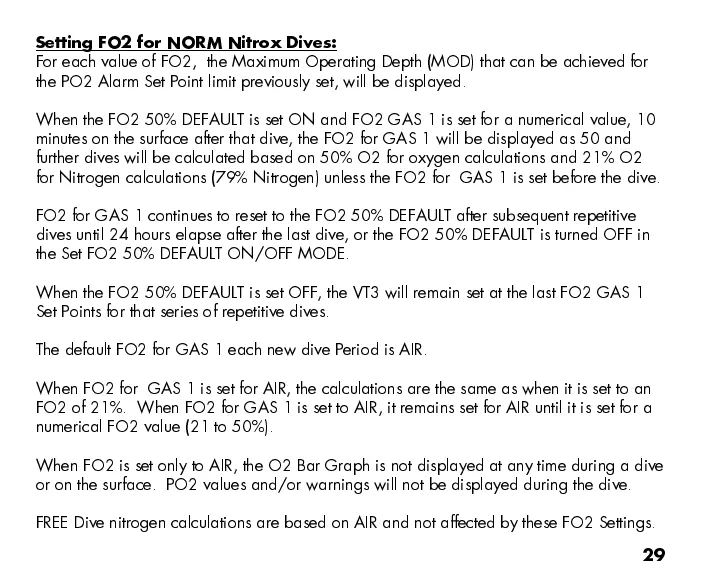 FREE Dive nitrogen calculations are based on AIR and not affected by these FO2 Settings.