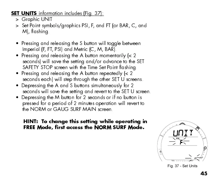 Imperial (F, FT, PSI) and Metric (C, M, BAR).