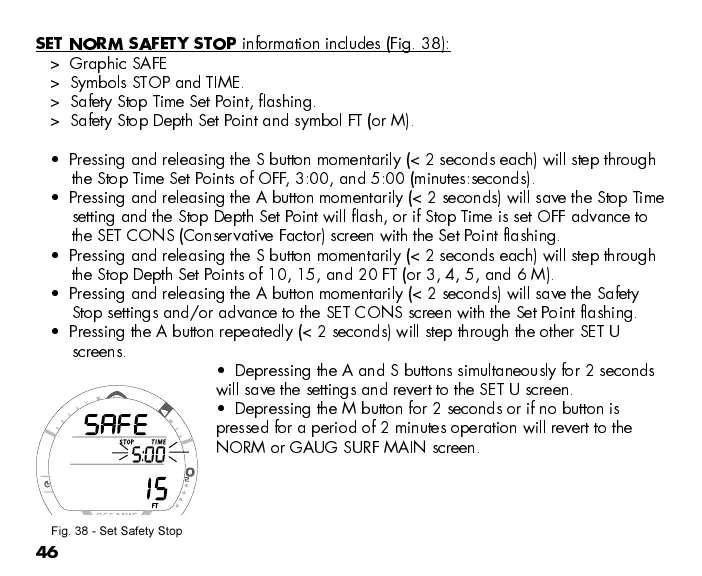 > Safety Stop Depth Set Point and symbol FT (or M).