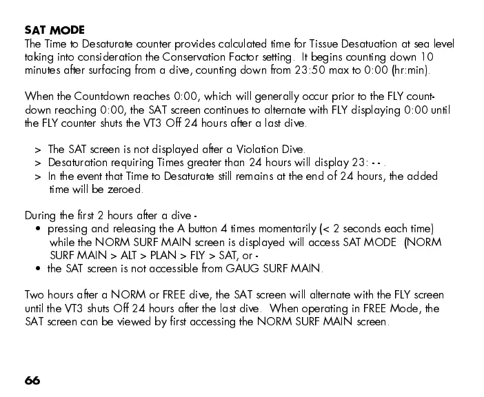 Two hours after a NORM or FREE dive, the SAT screen will alternate with the FLY screen