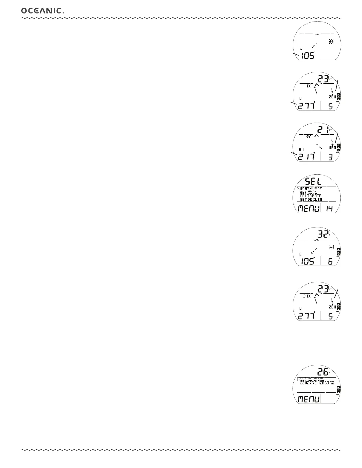 While on the surface, press M (< 2 sec) to access the Compass Menu to change the OP Mode, Calibrate, or set Declination.