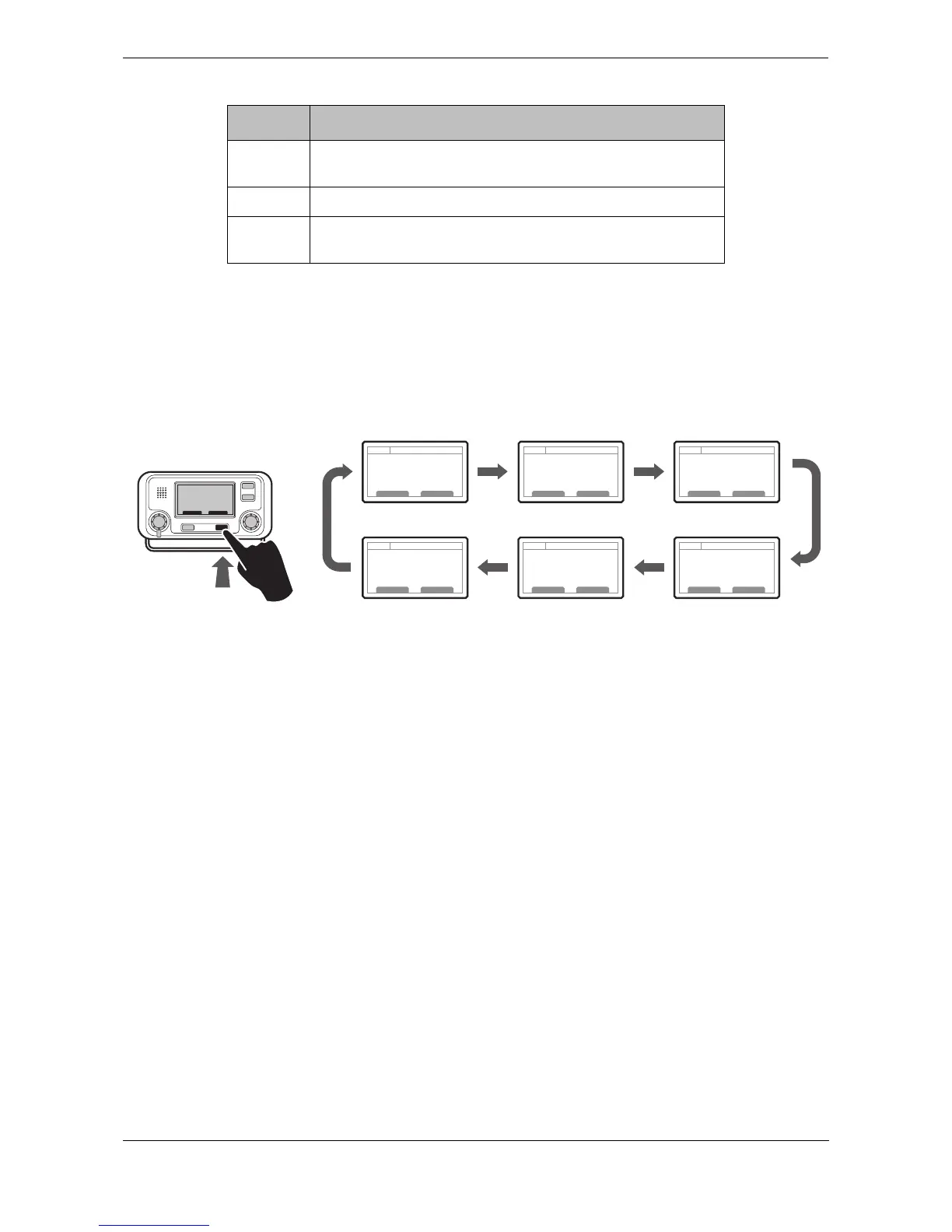 In normal operation the display shows one of six main operating screens. The next screen can be selected at