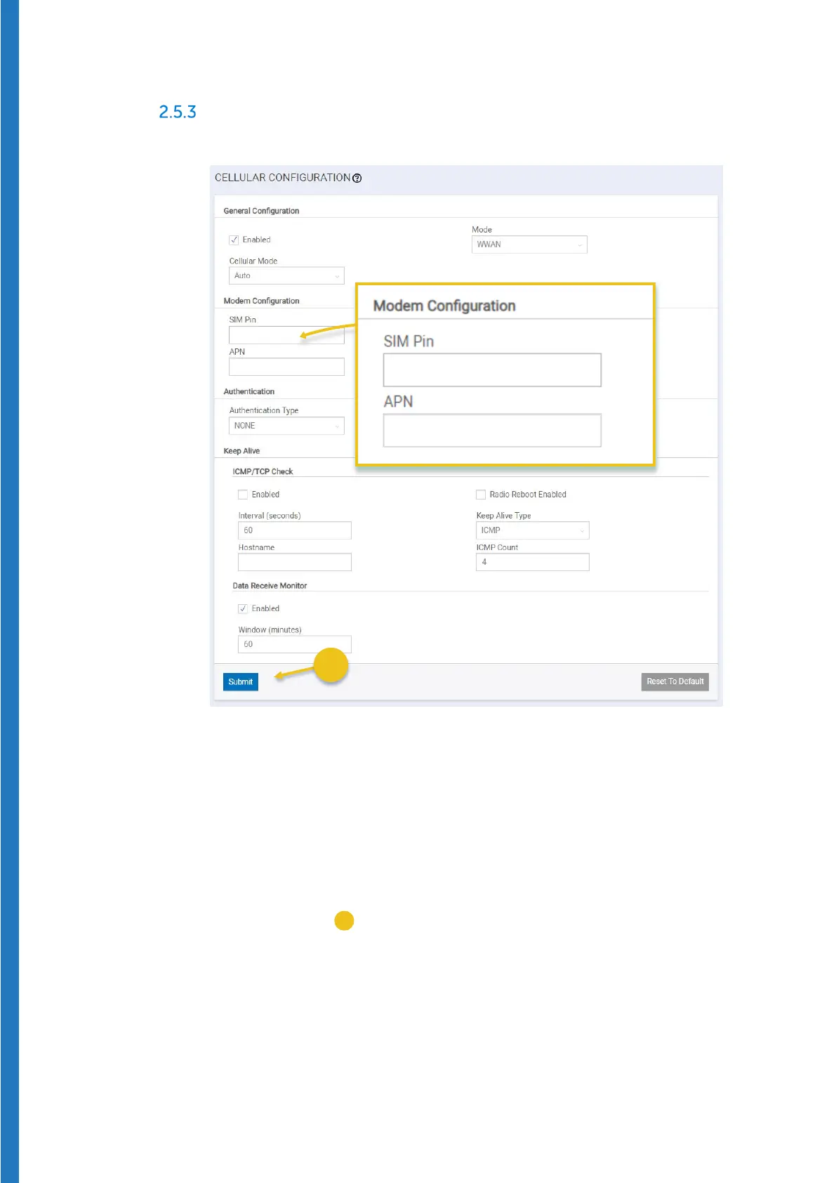 Figure 27 – Edit SIM Pin and APN fields for cellular communications