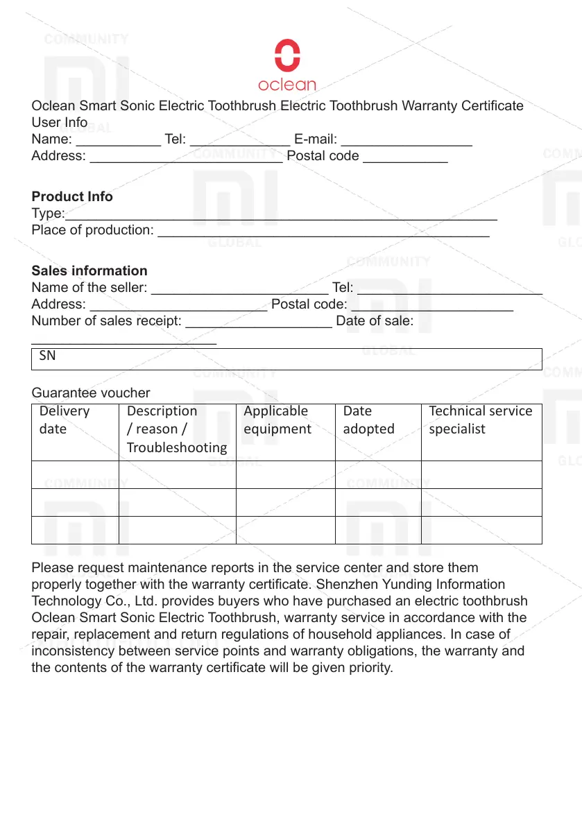 Oclean Smart Sonic Electric Toothbrush, warranty service in accordance with the
