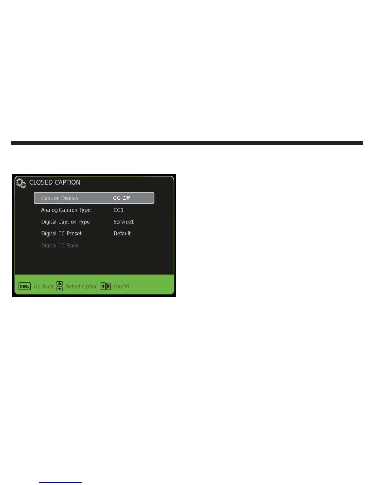 Caption Display: This turns on or off the closed caption-