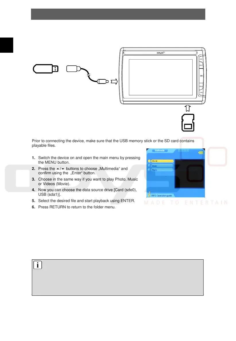 Prior to connecting the device, make sure that the USB memory stick or the SD card contains