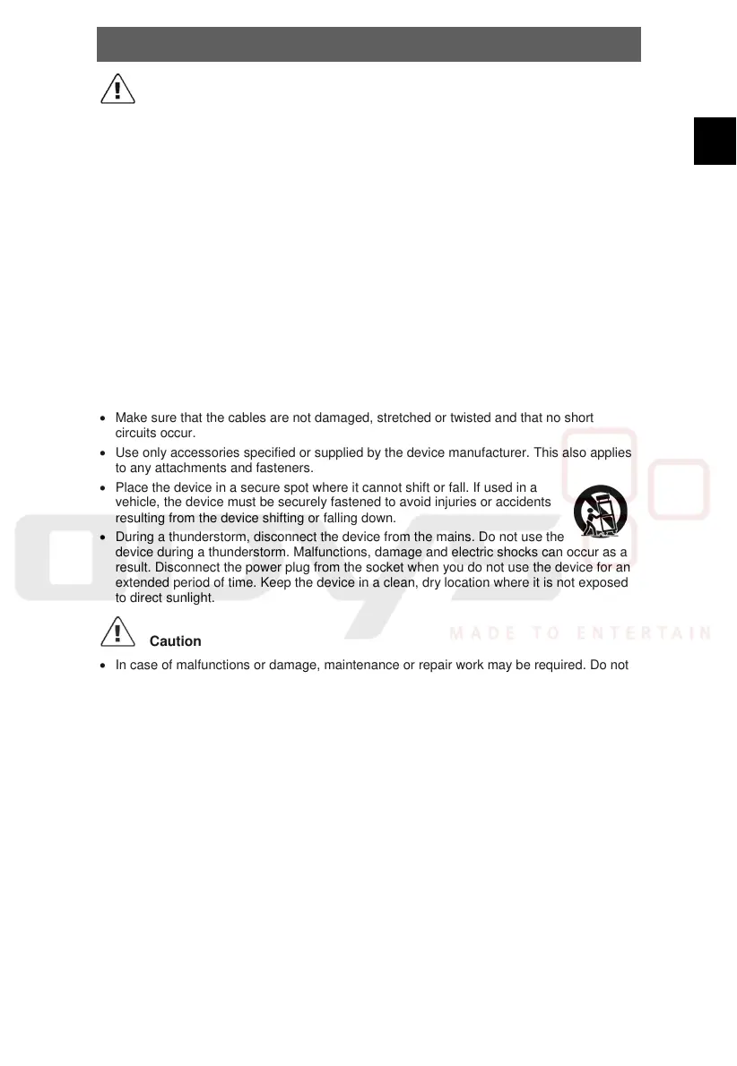 device during a thunderstorm. Malfunctions, damage and electric shocks can occur as a