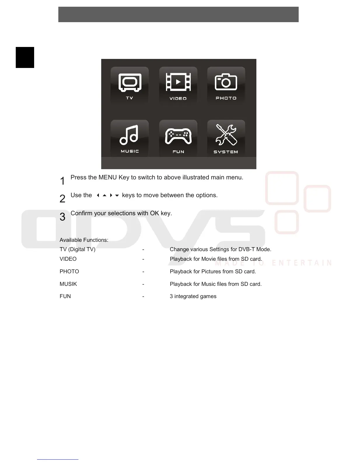Press the MENU Key to switch to above illustrated main menu.
