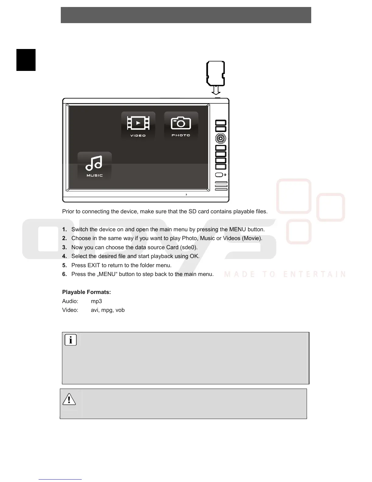 Prior to connecting the device, make sure that the SD card contains playable files.