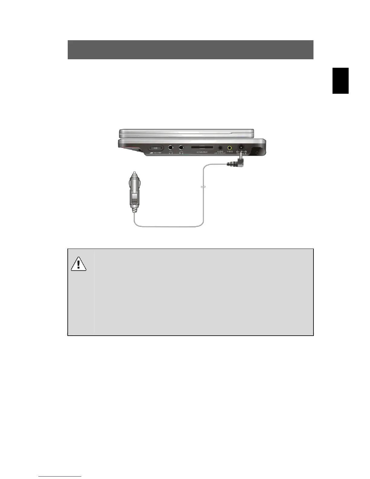 Use the supplied car adapter to operate the DVD player in a vehicle.
