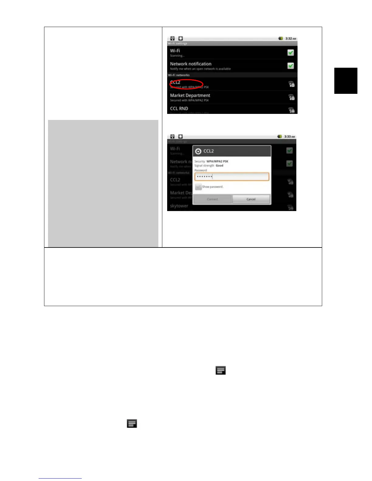(1) In the “Wi-Fi settings” screen, tap the Menu icon , and then tap “Scan.”