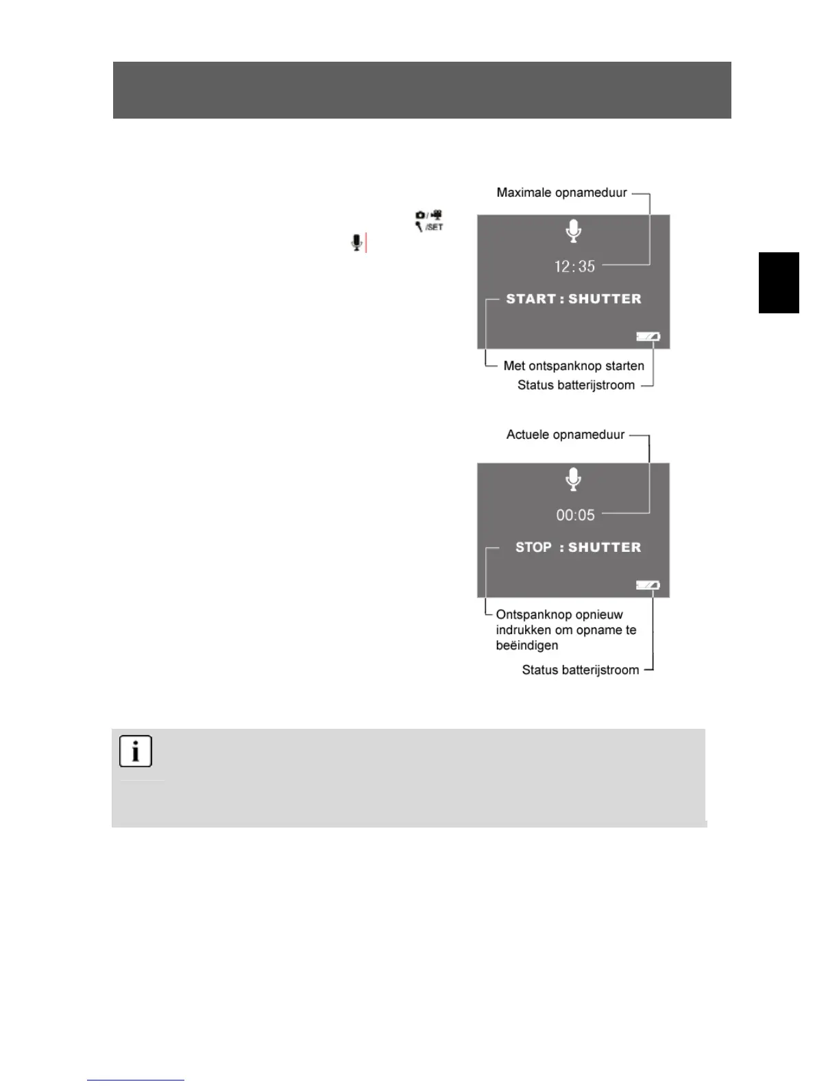 Het geluid wordt in WAV-formaat opgeslagen. De lengte van de opname