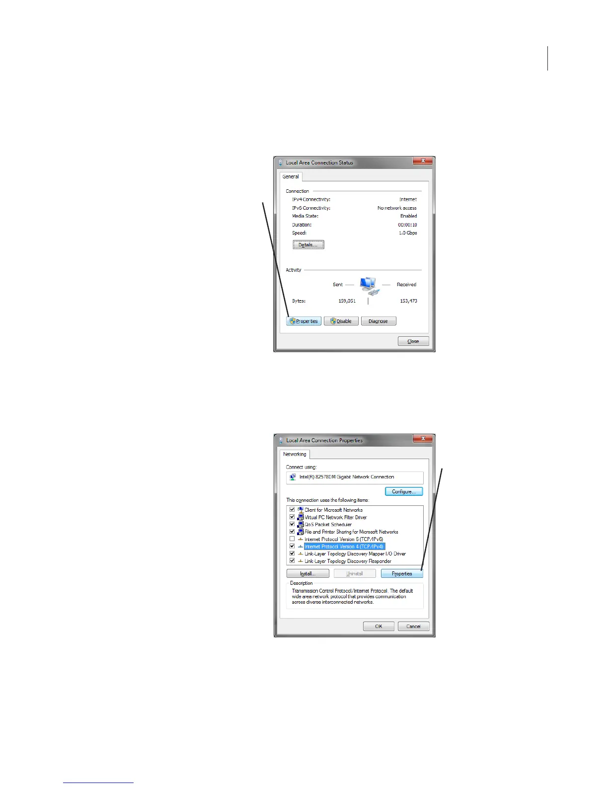 5) In the Local Area Connection Status window, click Properties on