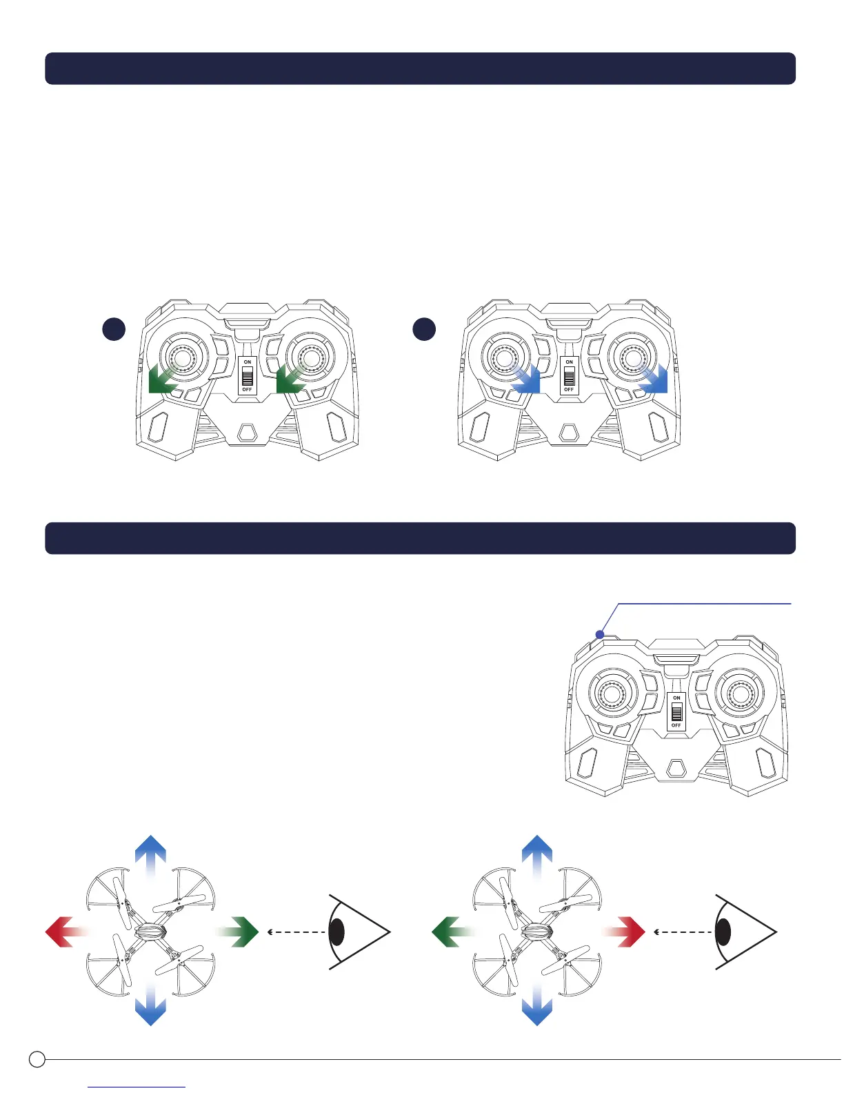 Push the throttle (left stick) and direction (right) stick both to the “7 o’clock” position (as the arrows show) for 3 seconds until the LED