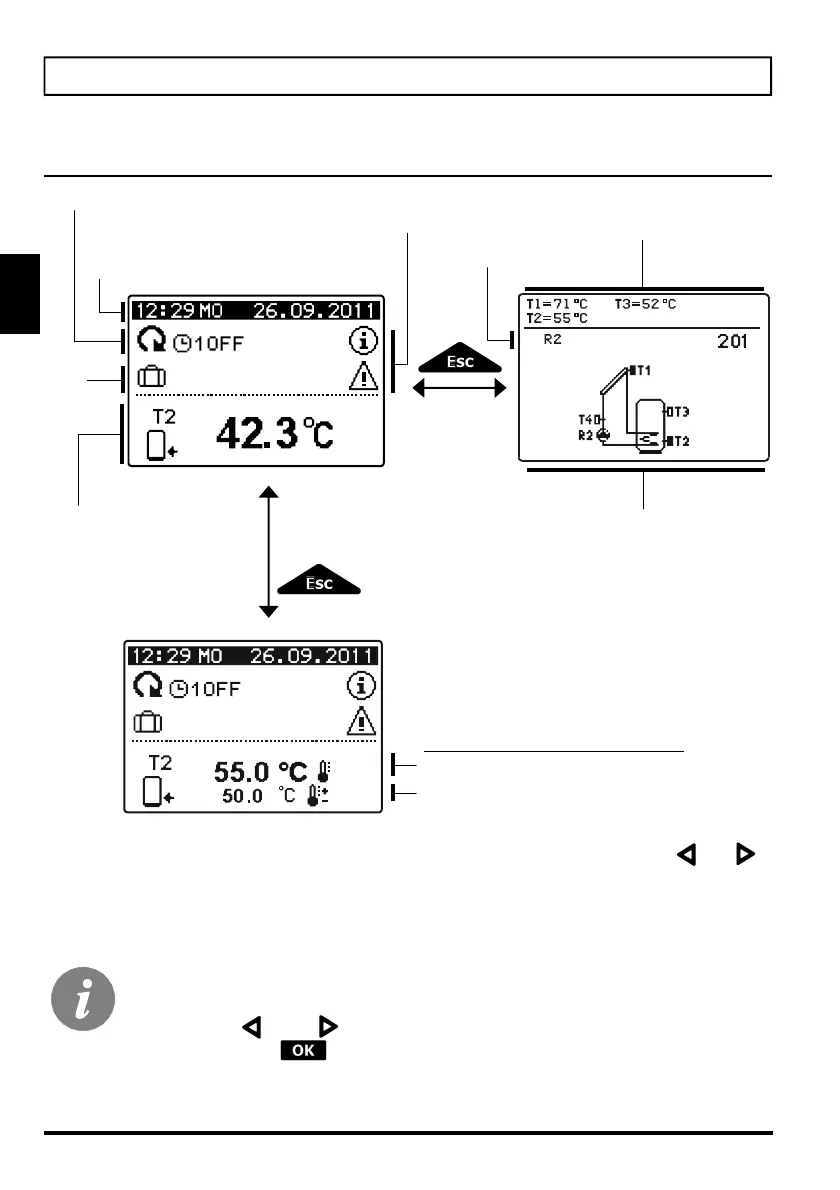 Um die Temperatur und andere Daten durchzusehen, benutzt man die Tasten und .