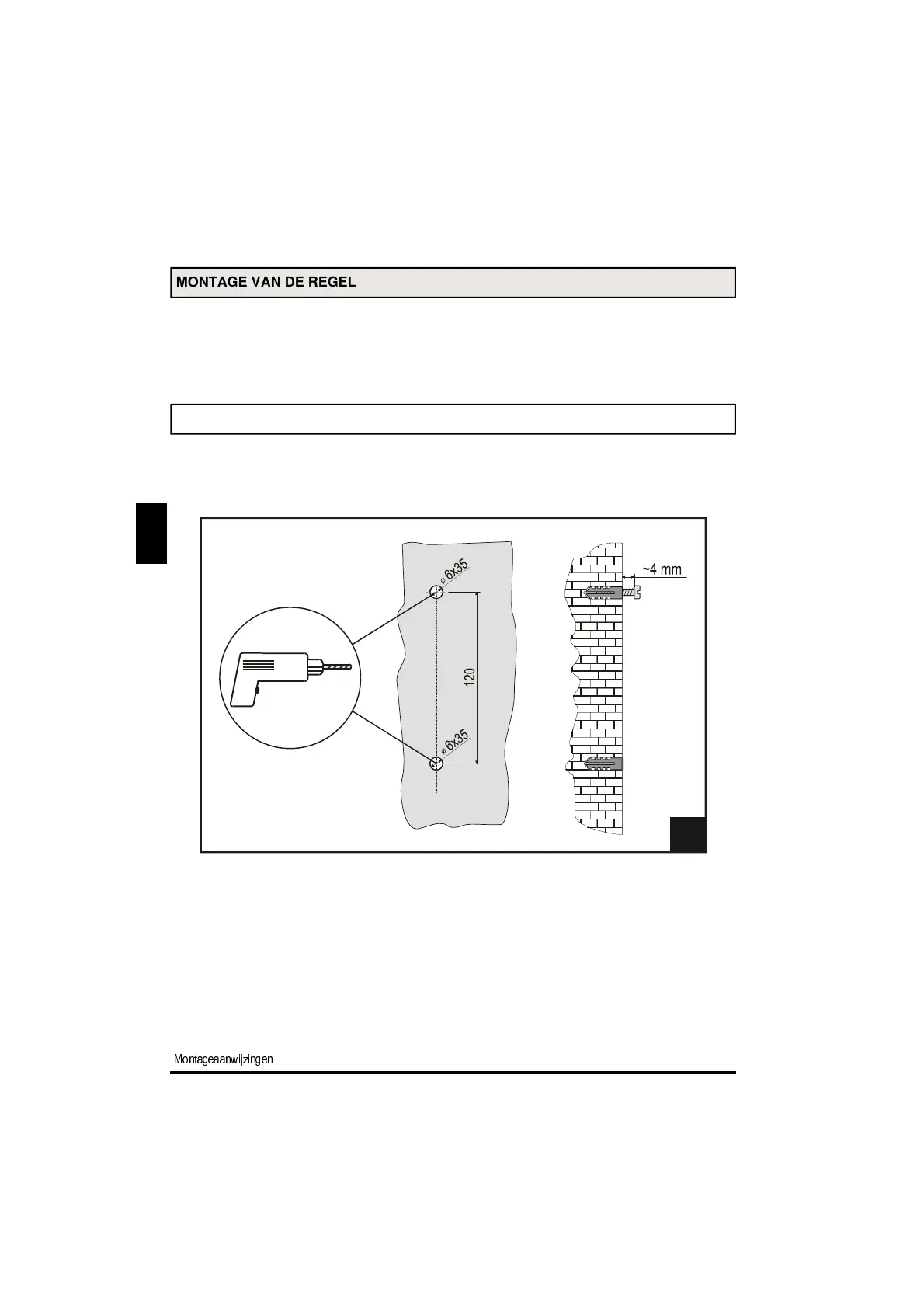 1. Op de montageplaats 2 gaten, 6 mm diameter en ca. 40 mm diepte, boren. De centrale