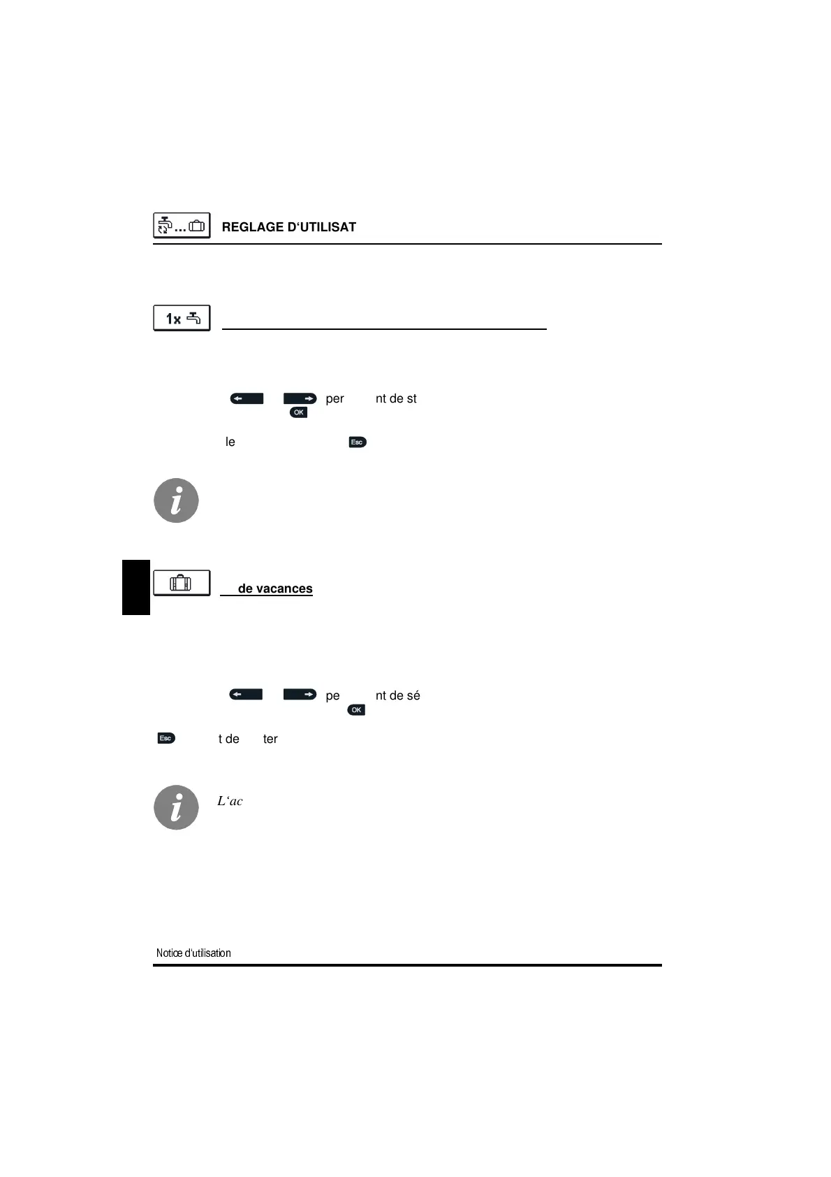 Les touches et permettent de sélectionner le mode vacances, de le démar-