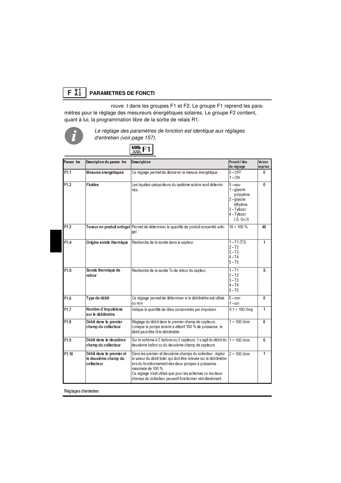 Ces paramètres se trouvent dans les groupes F1 et F2. Le groupe F1 reprend les para-