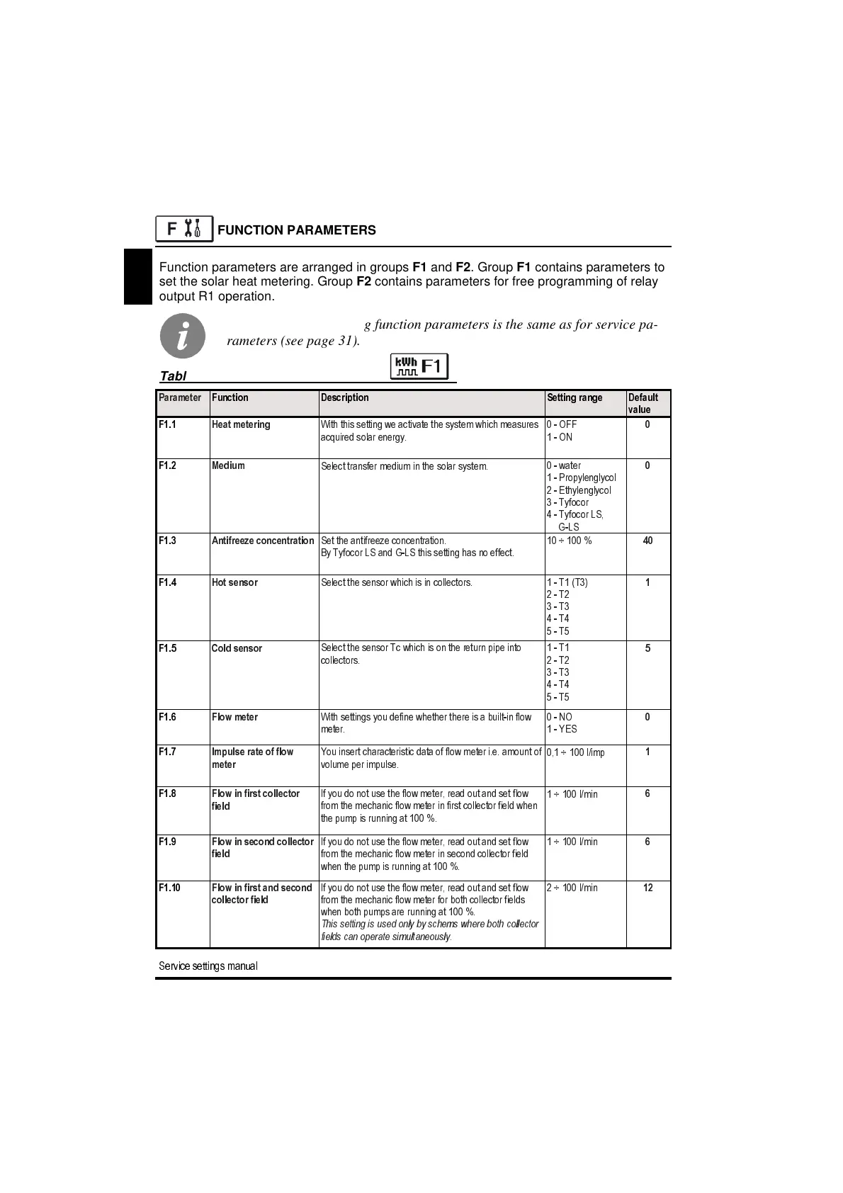 Function parameters are arranged in groups F1 and F2. Group F1 contains parameters to