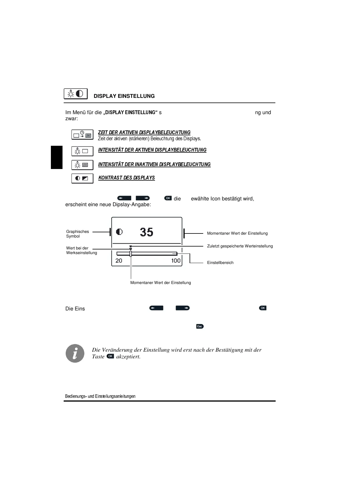 Die Einstellung wird mit den Tasten und verändert und mit der Taste
