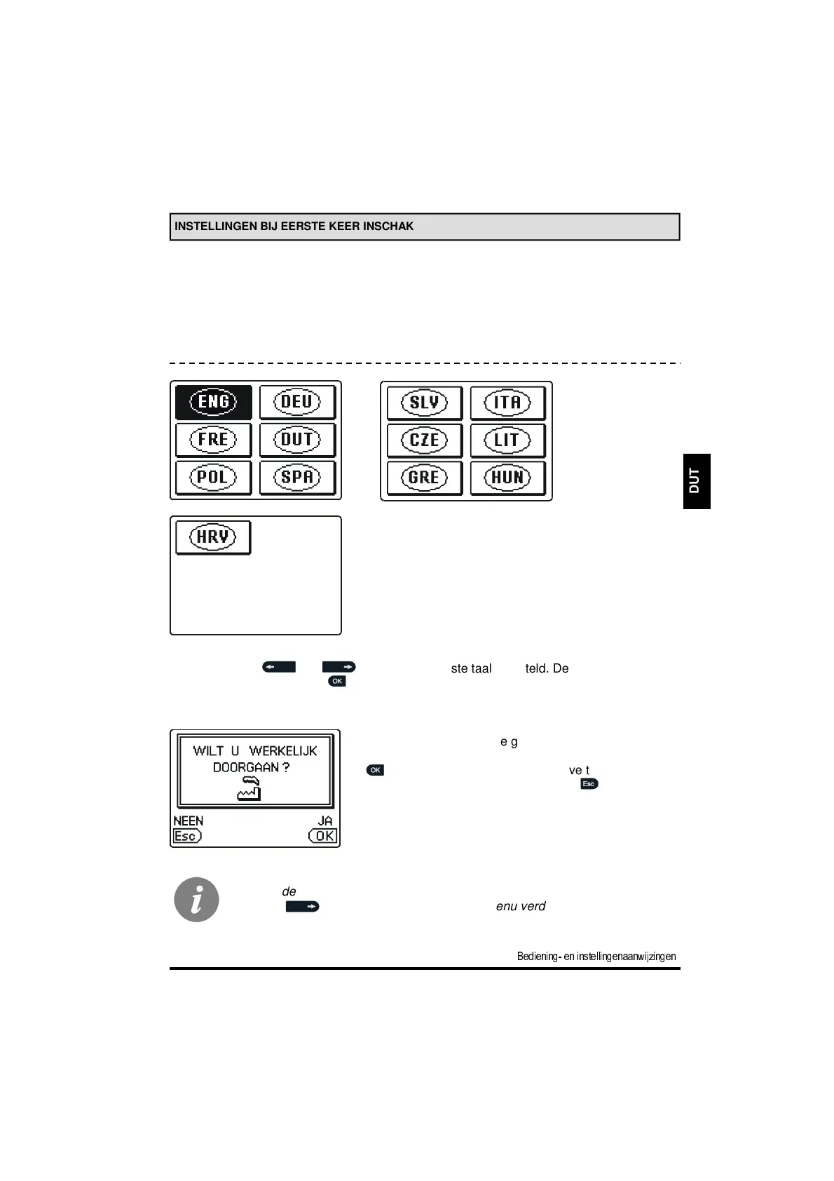 Met de toetsen en wordt de gewenste taal ingesteld. De taalkeuze wordt