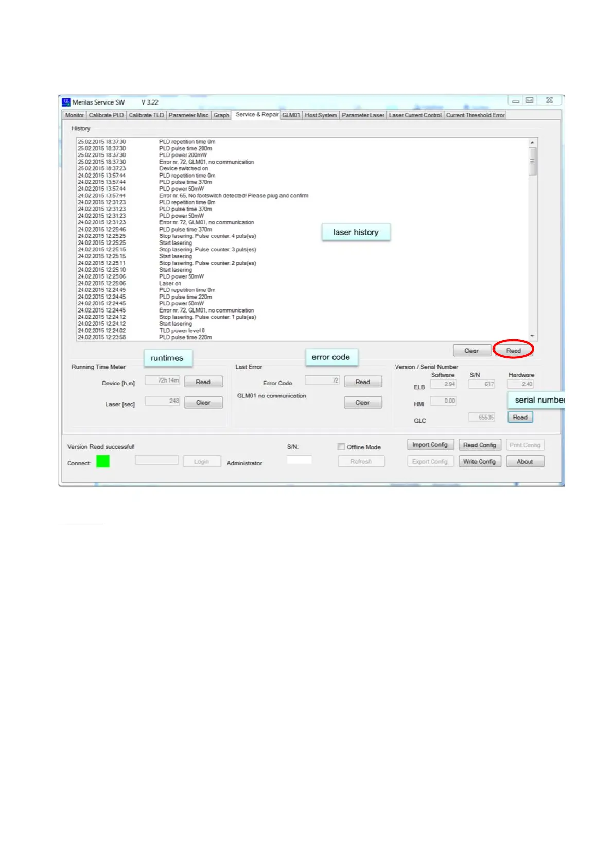 1. On this tab you can read the history, runtime, error code and version numbers.