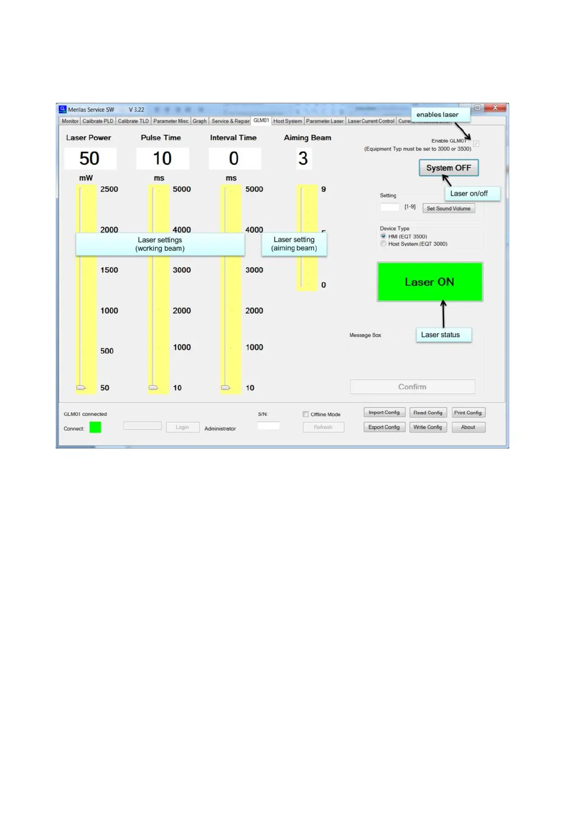 The front end allows controlling the laser module without the OS 4 front panel. Power, pulse and interval settings can be