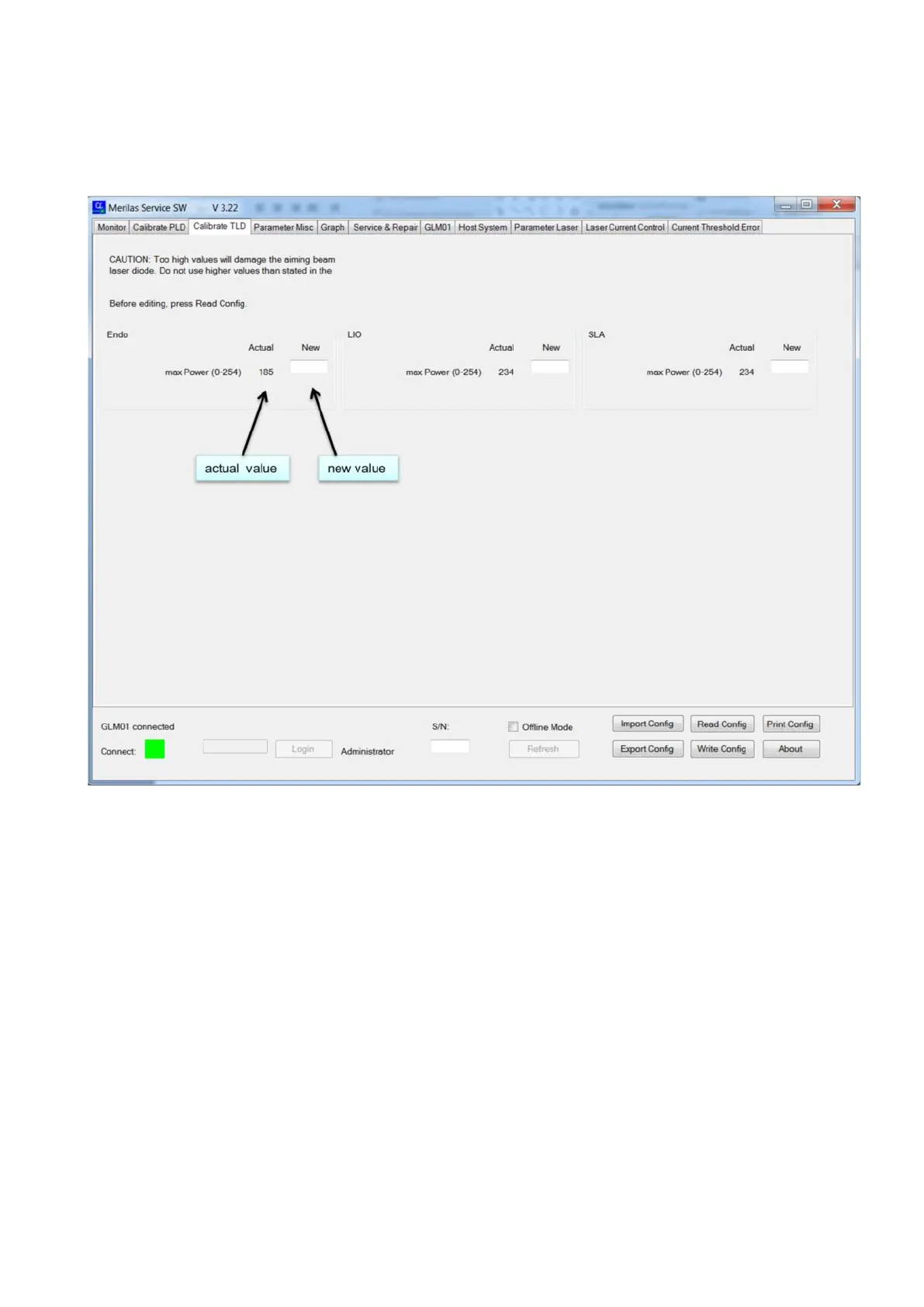 Calibration of the TLD is performed on this page. The current power value is shown and the new one is entered here.