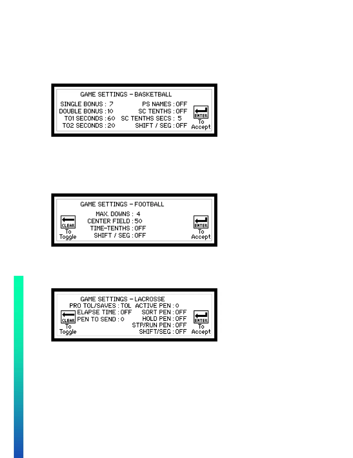 • TIME - THENTHS – Select to show tenths of seconds in the last minute of the Game Time.