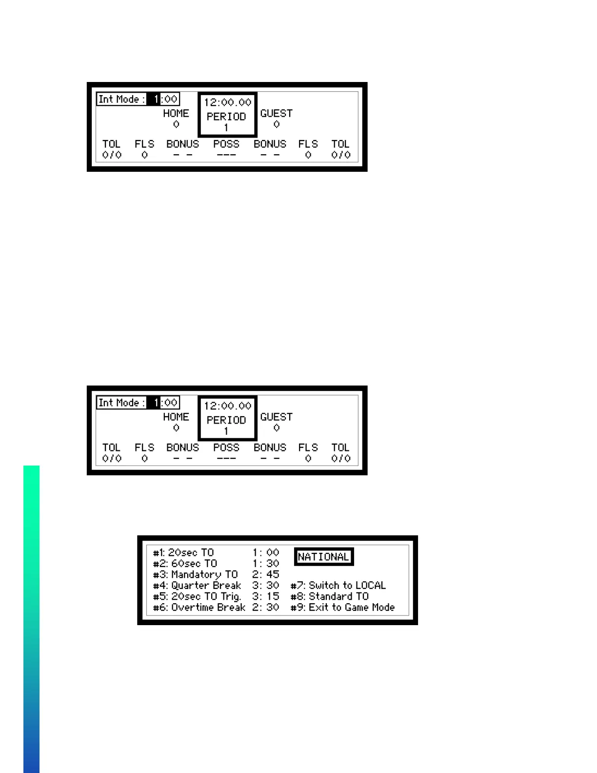 • Use game time RUN and STOP buttons to count down the INT MODE timer.