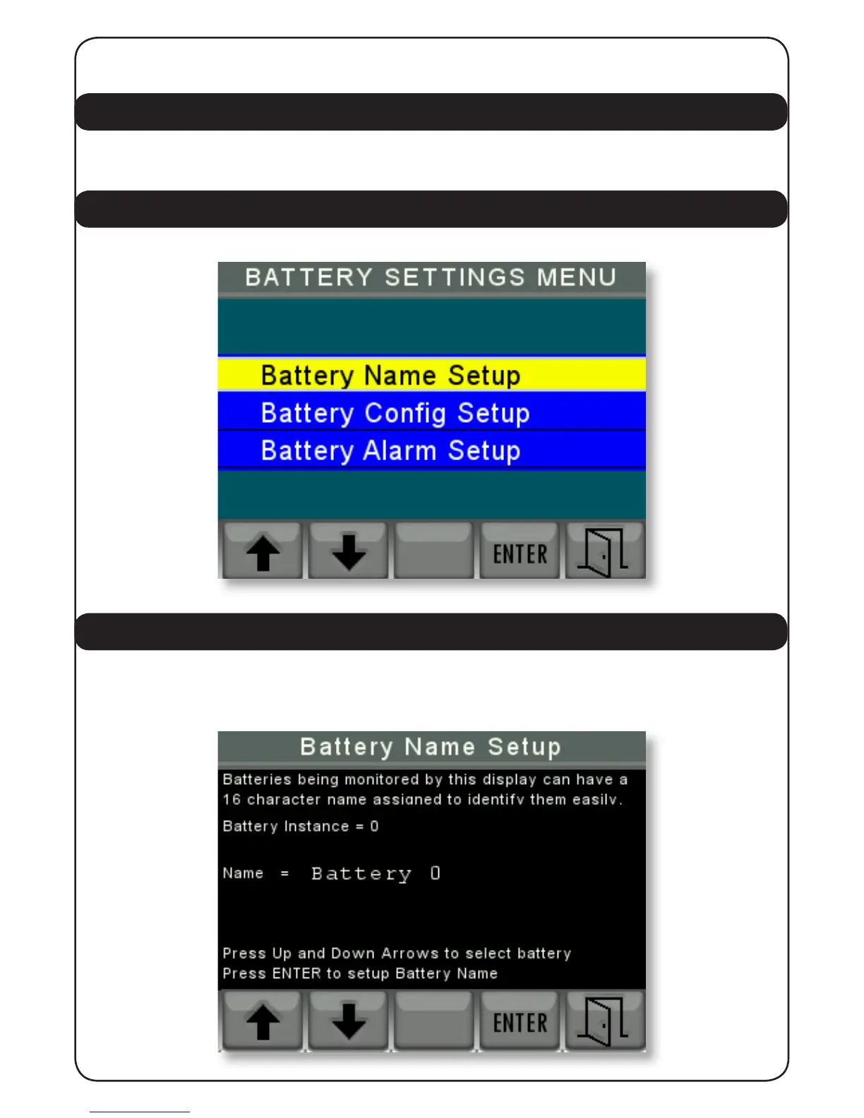 This screen is used to assign a 16 character name to each battery to identify the battery more