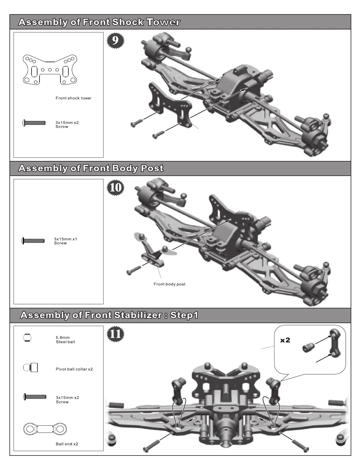 Ofna Racing HYPER10-TT - Front Chassis Components Assembly; Front Shock Tower Installation; Front Body Post Mounting; Front Stabilizer Installation (Step 1)