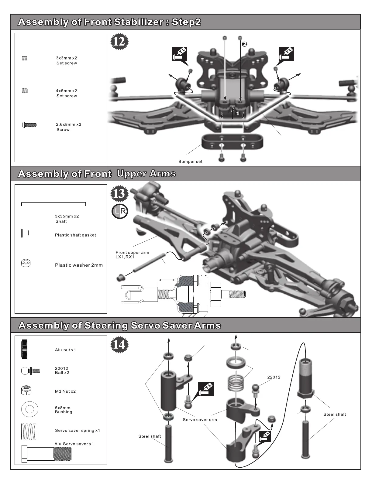 Ofna Racing HYPER10-TT - Front Steering and Stabilizer Assembly; Front Stabilizer Installation (Step 2); Front Upper Arms Installation; Steering Servo Saver Assembly