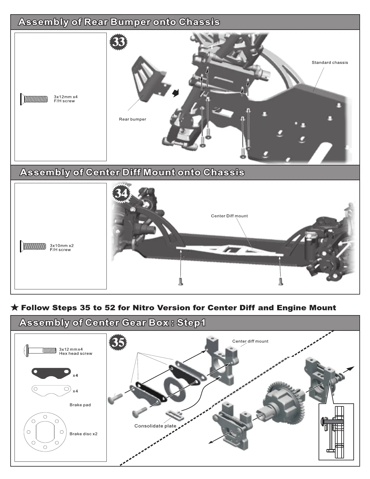 Ofna Racing HYPER10-TT - Rear Bumper and Center Differential Mount; Rear Bumper Mounting to Chassis; Center Differential Mount Installation; Center Gearbox Assembly (Step 1)