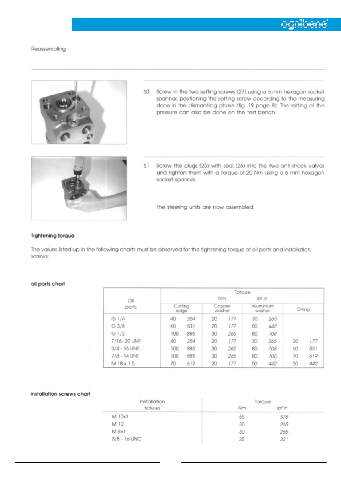 Ognibene STA - Tightening Torque; Oil Ports Torque Specifications; Installation Screws Torque