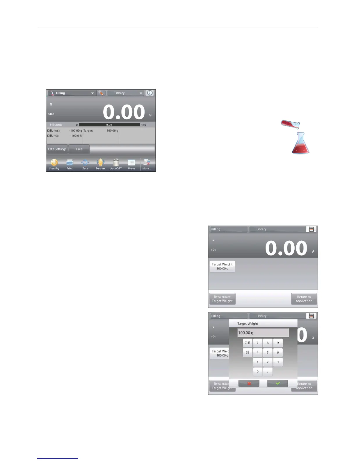 This application allows the user to slowly fill a container to a pre-determined target weight. The progress bar