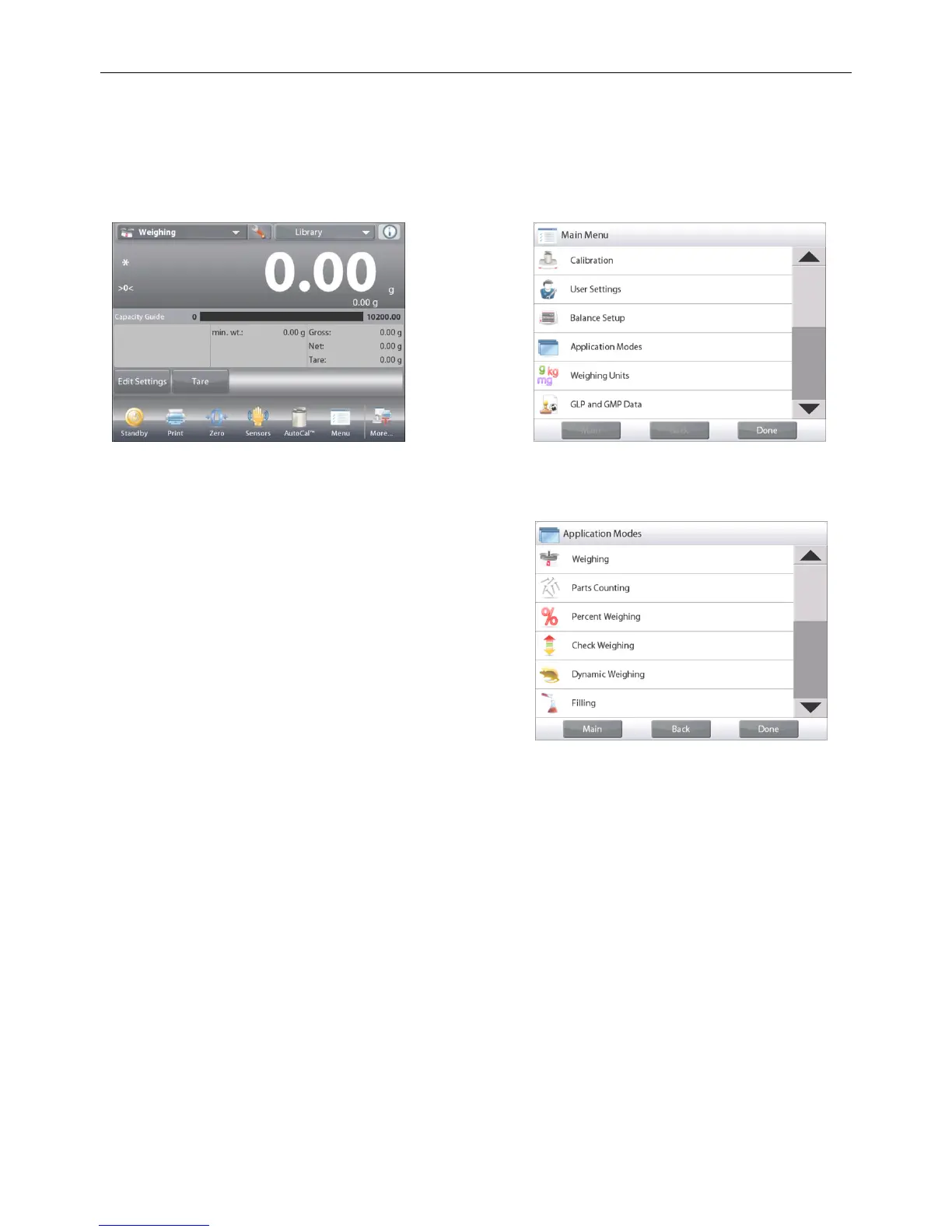 Home screen. The Main menu appears, with buttons for Main, Back and Done. Continue touching the