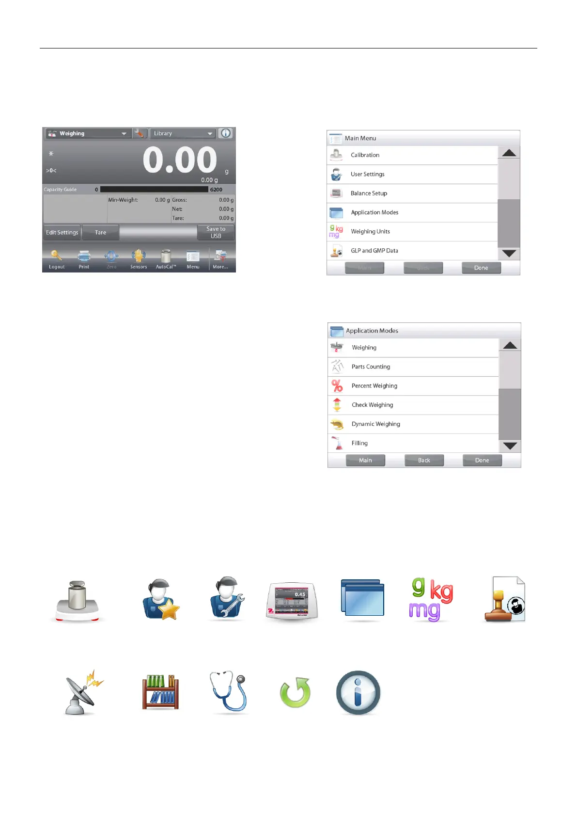 Home screen. The Main menu appears, with buttons for Main, Back and Done. Continue touching the