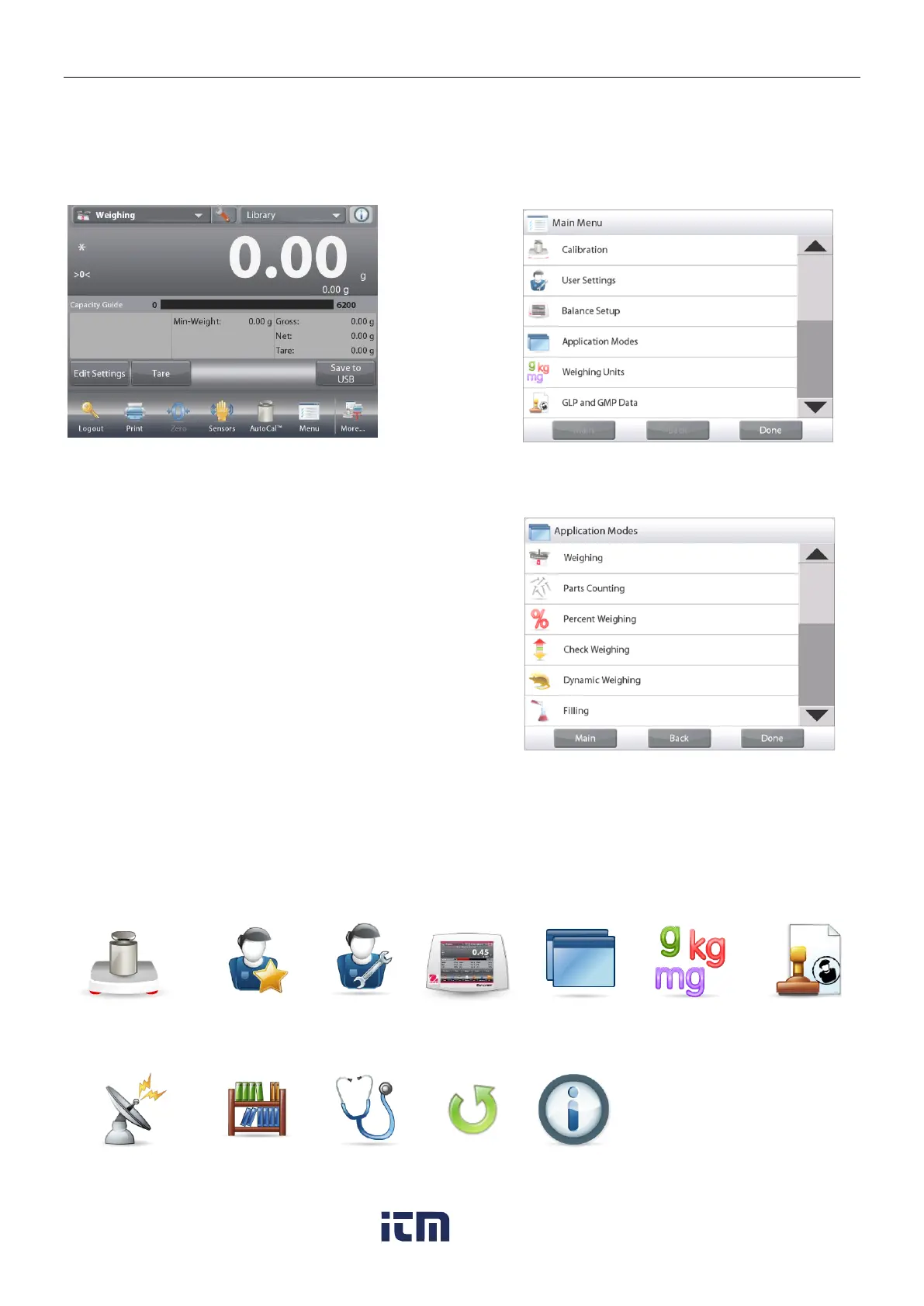 Home screen. The Main menu appears, with buttons for Main, Back and Done. Continue touching the