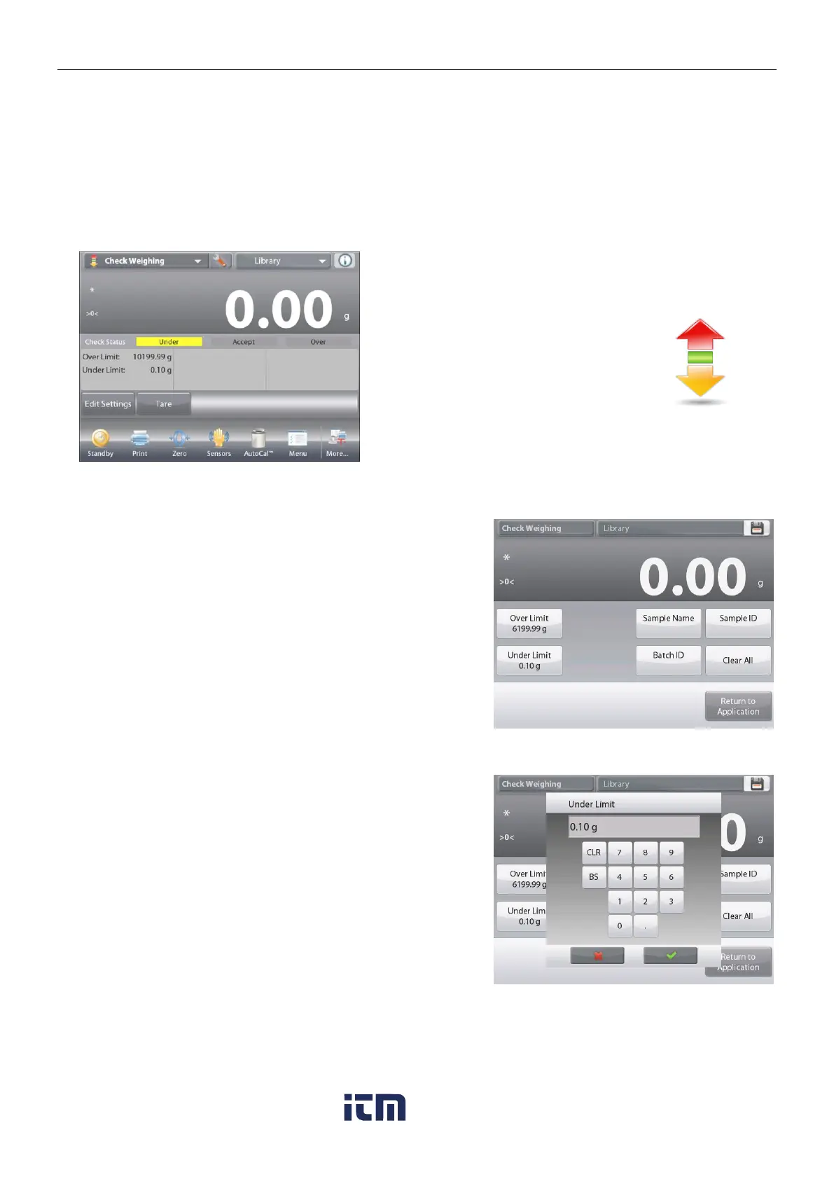 The default (or last) Check weigh limits are displayed. Place objects on the pan. The Under/Accept/Over status
