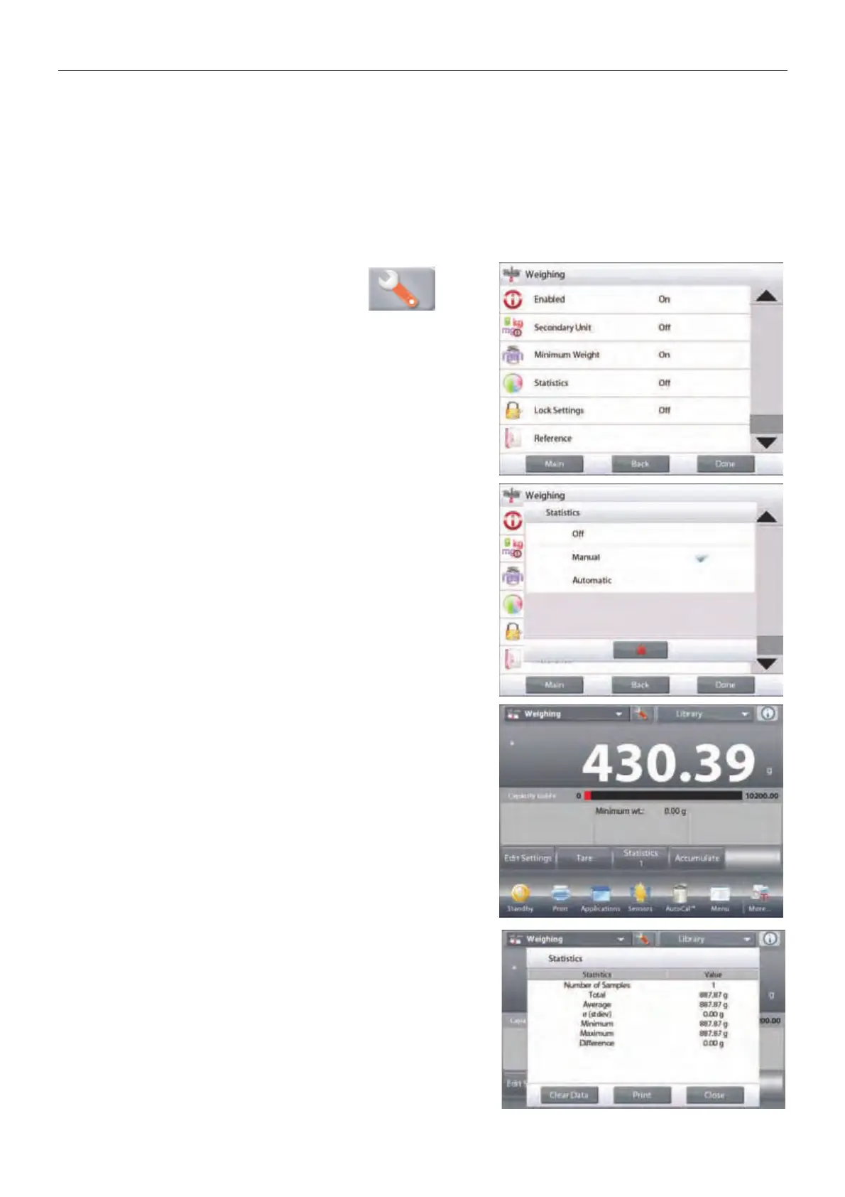 Statistics can be determined manually (requires key press after each step) or automatically (weights are