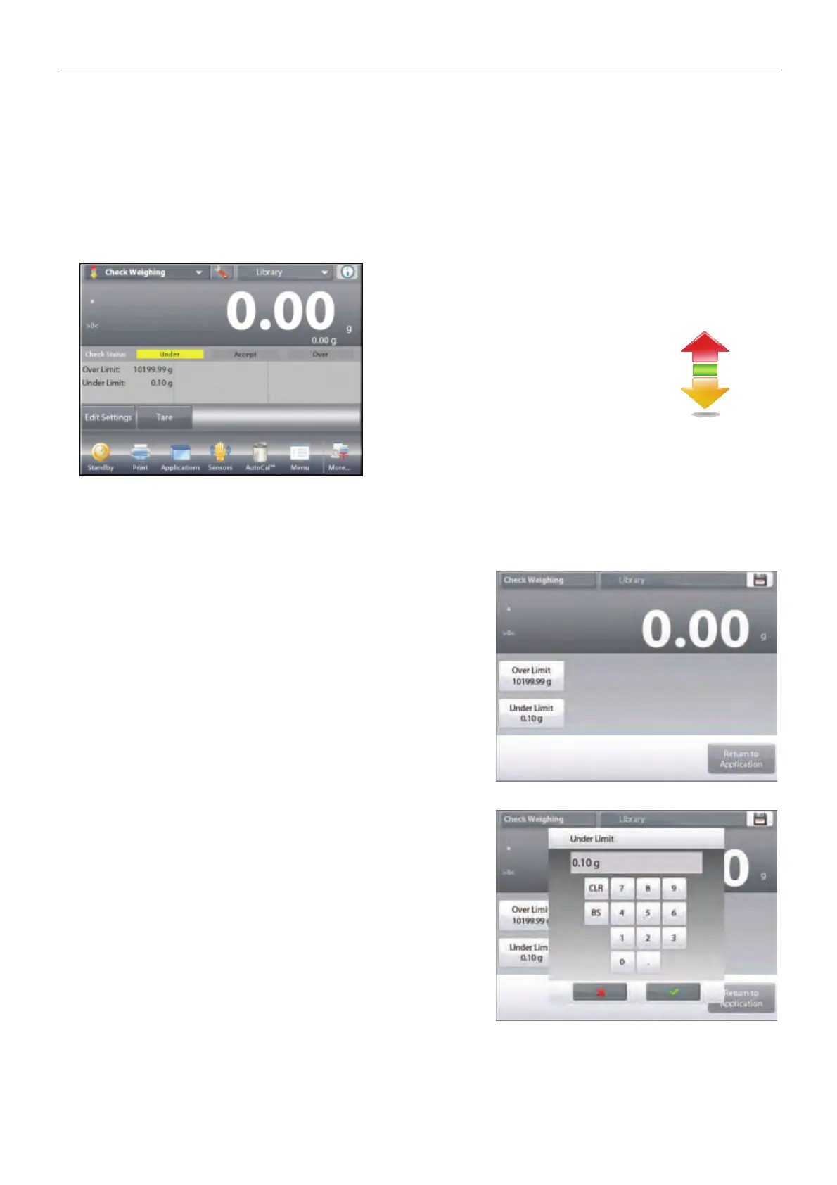 The default (or last) Check weigh limits are displayed. Place objects on the pan. The Under/Accept/Over status