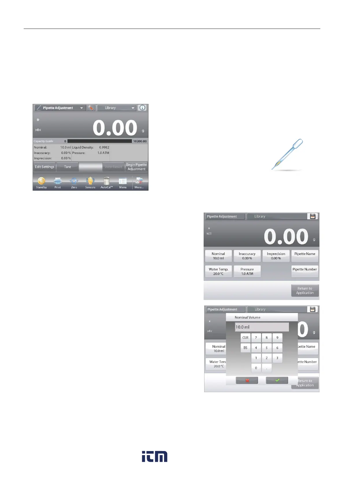Pipette adjustment can be accomplished manually (with a key press after each step) or automatically (weights