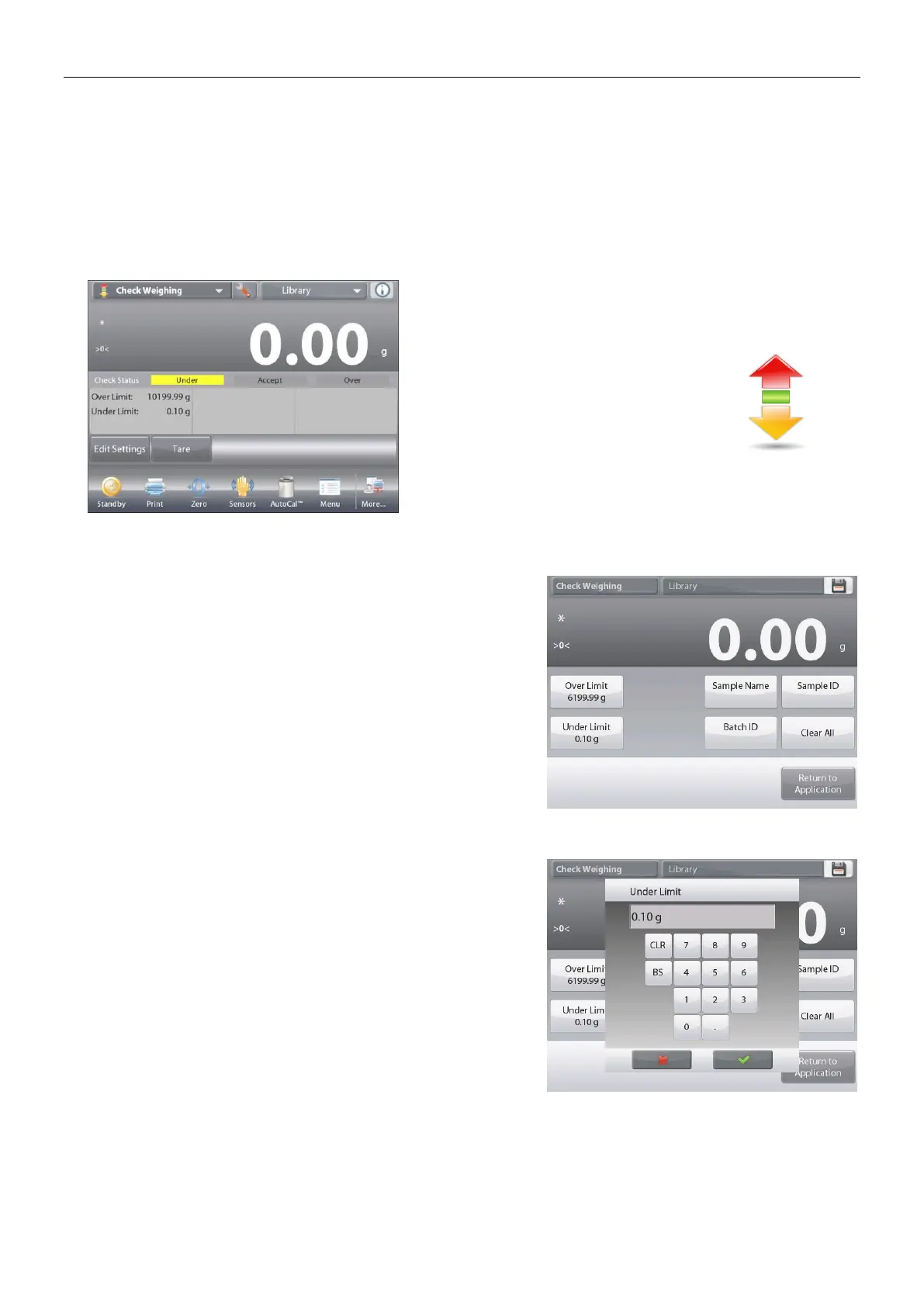 The default (or last) Check weigh limits are displayed. Place objects on the pan. The Under/Accept/Over status