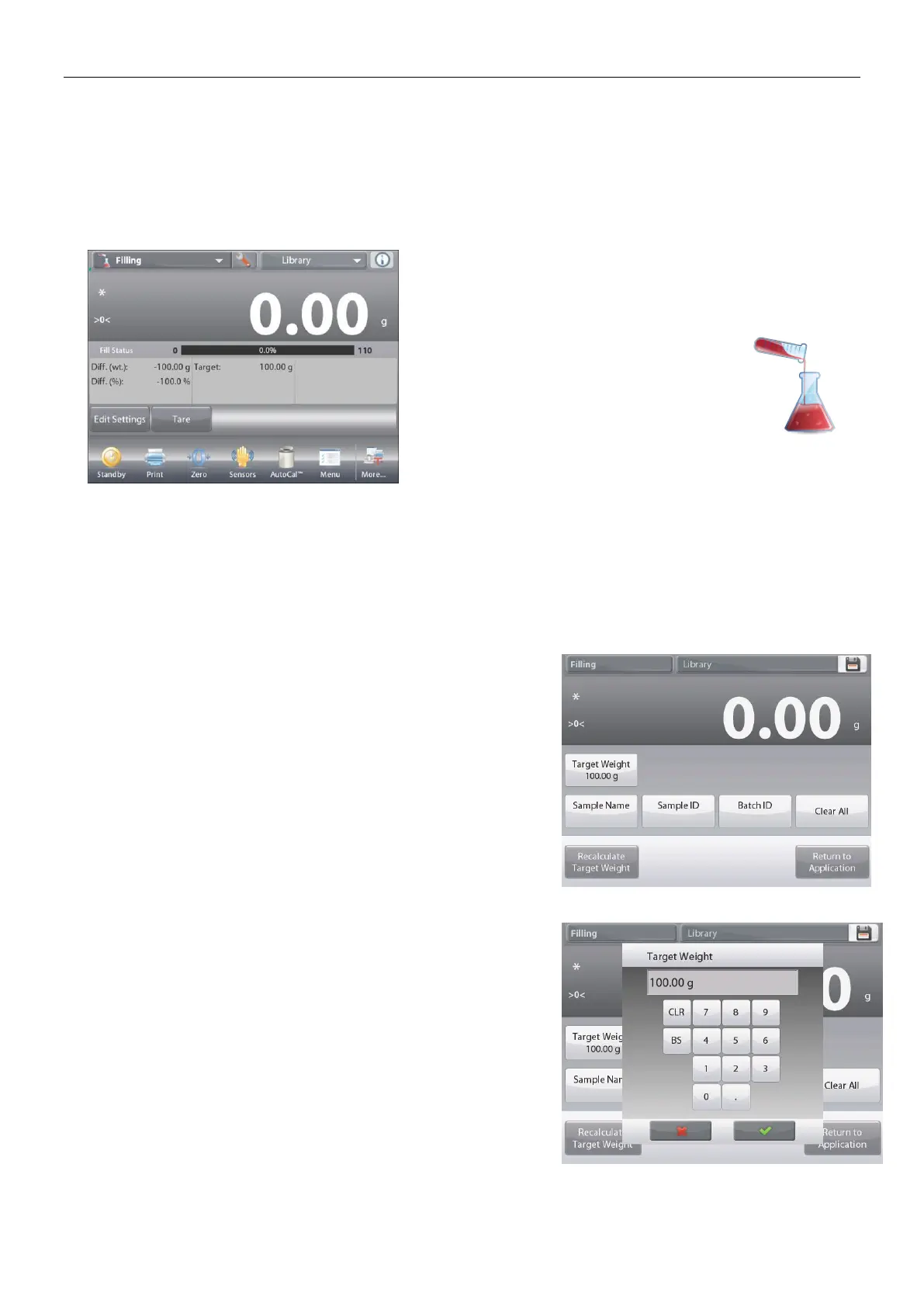 This application allows the user to slowly fill a container to a pre-determined target weight. The progress bar