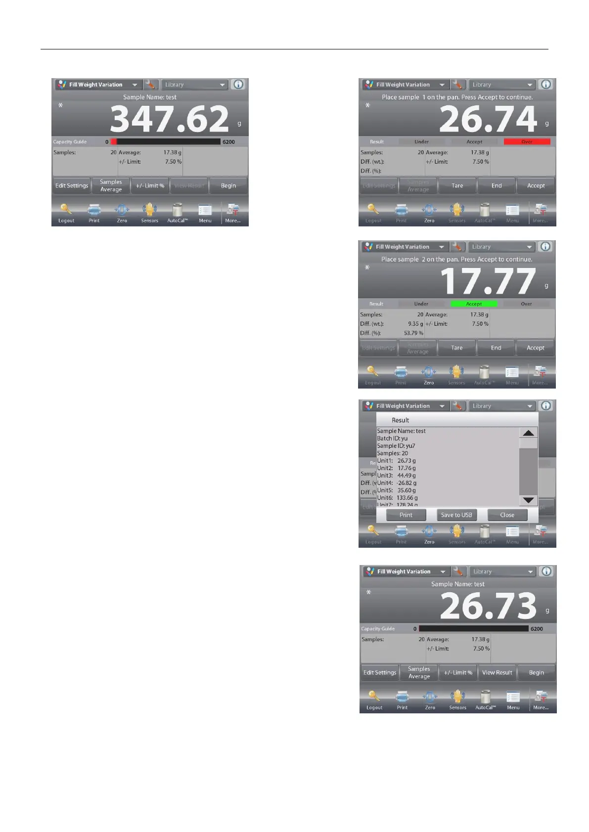 and touch the Accept button to store each sample’s weight.